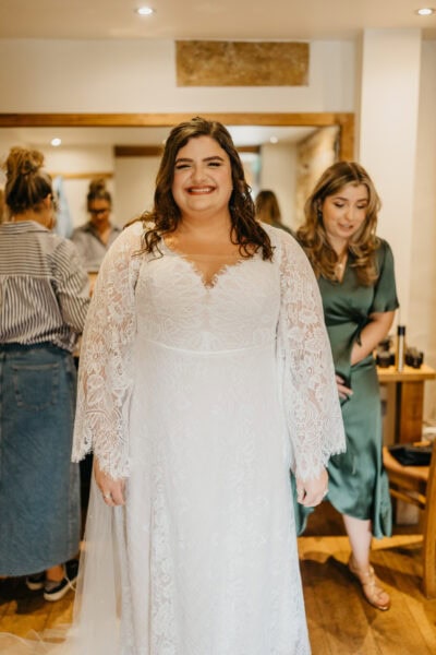 Gemma looked radiant in the Grace gown, a beautifully crafted lace design that highlights both comfort and elegance. The gown’s intricate lace details, V-neckline, and flowing silhouette created a timeless bridal look. Studio Levana’s signature built-in corset ensured Gemma felt supported and confident her plus-size boho wedding dress.