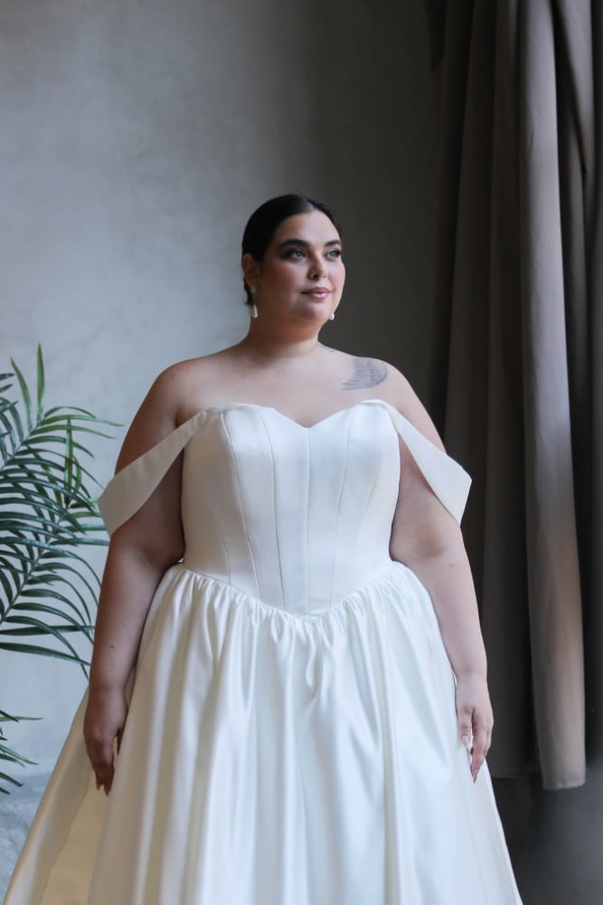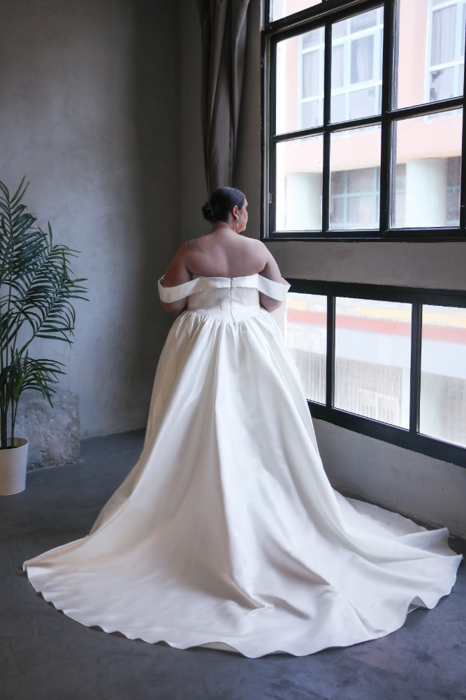 The Audrey gown is a timeless A-line satin dress with a sweetheart neckline and elegant off-the-shoulder draped sleeves and basque waist. Perfect for the bride seeking a blend of classic and modern romance.