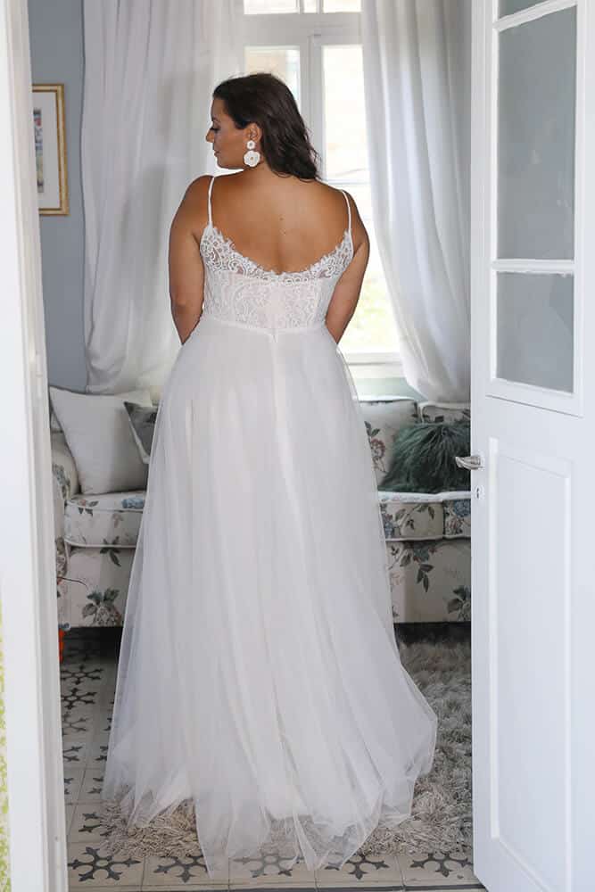 Introducing Ava: an ethereal boho-inspired wedding dress with French eyelash lace and a flowing silk tulle skirt. Its accentuated waistline and airy straps add playfulness, creating a seductive form. Perfect for a modern fairytale romance, Ava invites you to write your own love story.