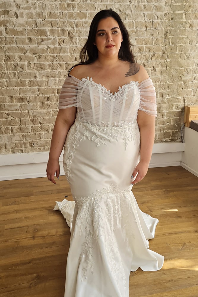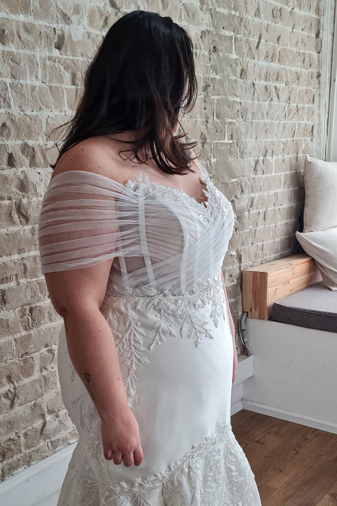 Experience the exquisite allure of the Bromie gown, crafted from luxurious mikado fabric. The pleated tulle bodice and sheer corset offer comfort and support, while the off-the-shoulder sleeves create a captivating look. This gown embodies feminine elegance and modern sophistication, perfect for celebrating your unique love story.