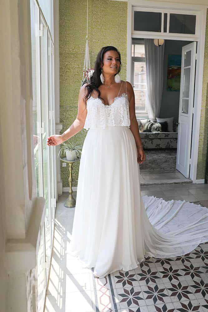 Celebrate your free spirit with the Caroline gown, crafted from French eyelash lace with a cotton wool texture. The illusion strap sleeves with pearls add sophistication, while the flowing chiffon skirt offers romantic elegance. Available in ivory or nude, perfect for the modern boho bride.