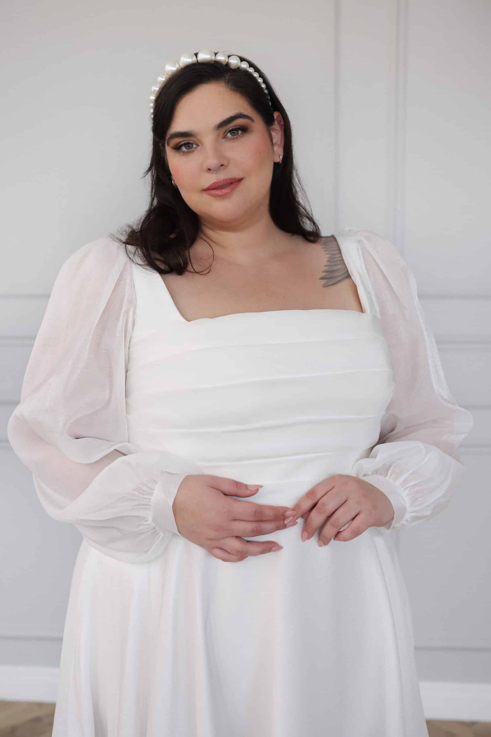 The Dalilah Ivory gown is a dreamy blend of romance and elegance. Crafted from soft, shimmering fabric, it features a ruched bodice with a square neckline and a flowing A-line skirt. The gown offers versatile styling with detachable airy sleeves—choose between delicate puff sleeves or graceful long bishop sleeves for a custom bridal look.