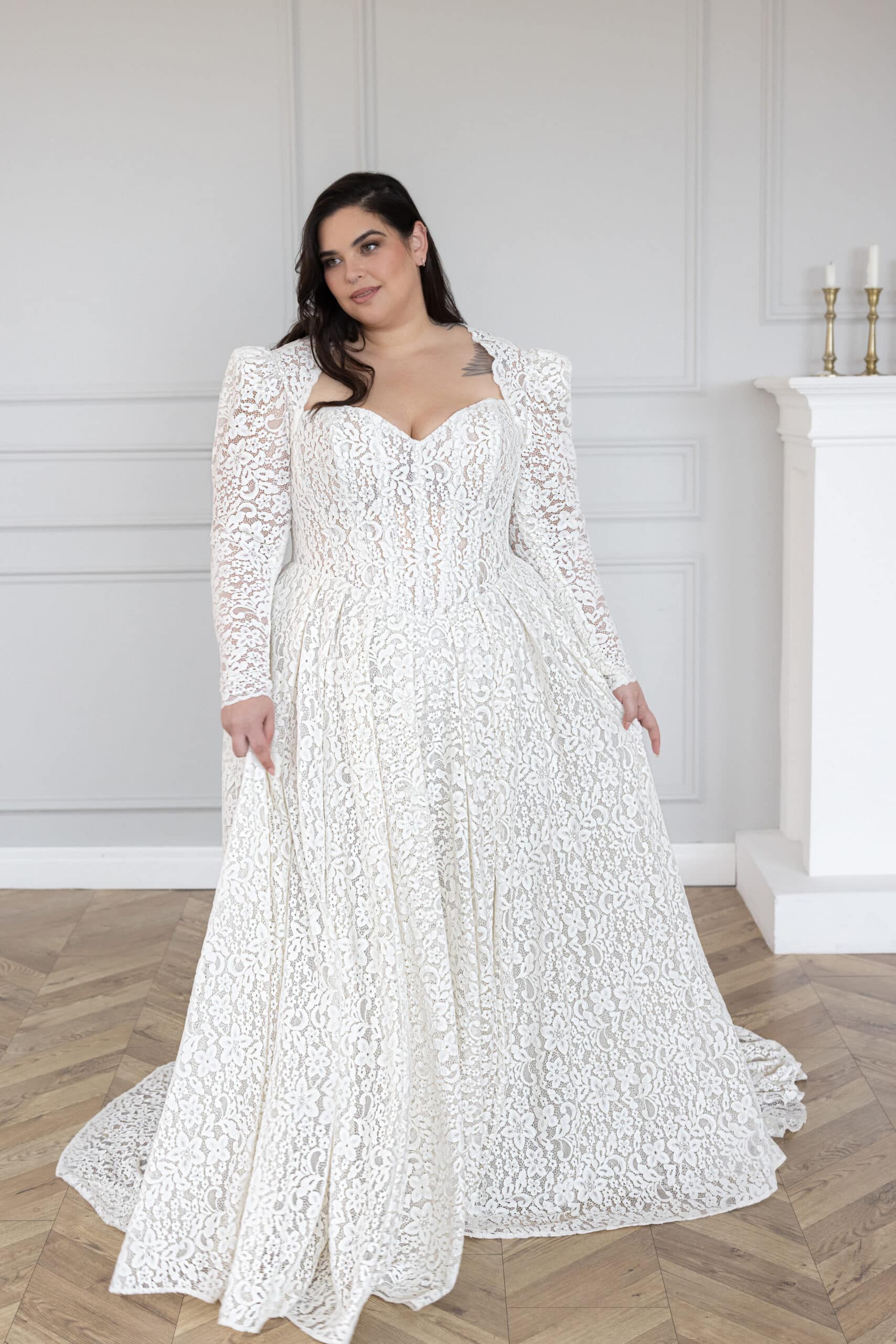 The Dove lace bolero is a breathtaking addition for brides seeking both elegance and drama. Crafted from delicate floral lace, it features structured shoulders and long fitted sleeves, creating a regal silhouette. The bolero seamlessly enhances the strapless gown, offering extra coverage while maintaining a romantic and vintage-inspired aesthetic. Perfect for brides who want to make a statement with timeless sophistication.