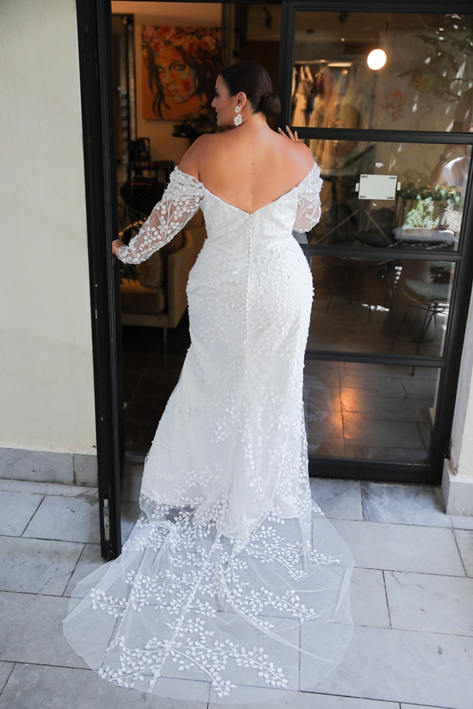 Experience allure with our Fiora Fitted gown, showcasing off-the-shoulder sleeves and intricate 3D petals lace. The corset top ensures a flattering fit, enhancing your curves with grace. The flowing silhouette with delicate floral imprints adds whimsy and charm, perfect for the bride seeking elegance and individuality.