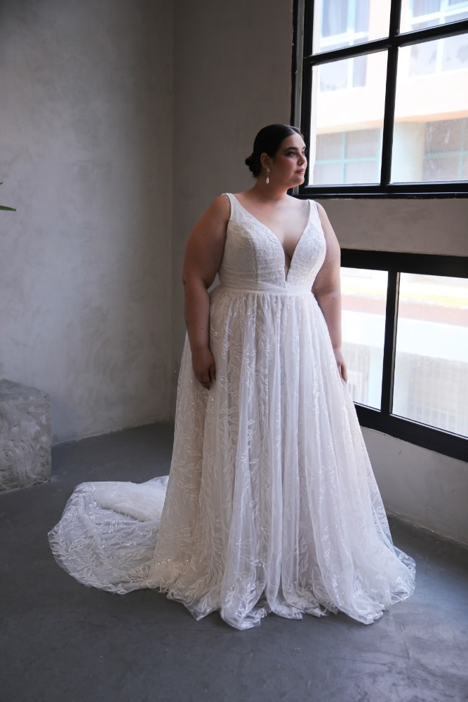 Gabrielle offers a sophisticated A-line bridal gown with intricate sequin foliage details, a plunging V-neckline, and elegant long sleeves. This design combines timeless appeal with modern style, ideal for brides seeking a nature-inspired look.