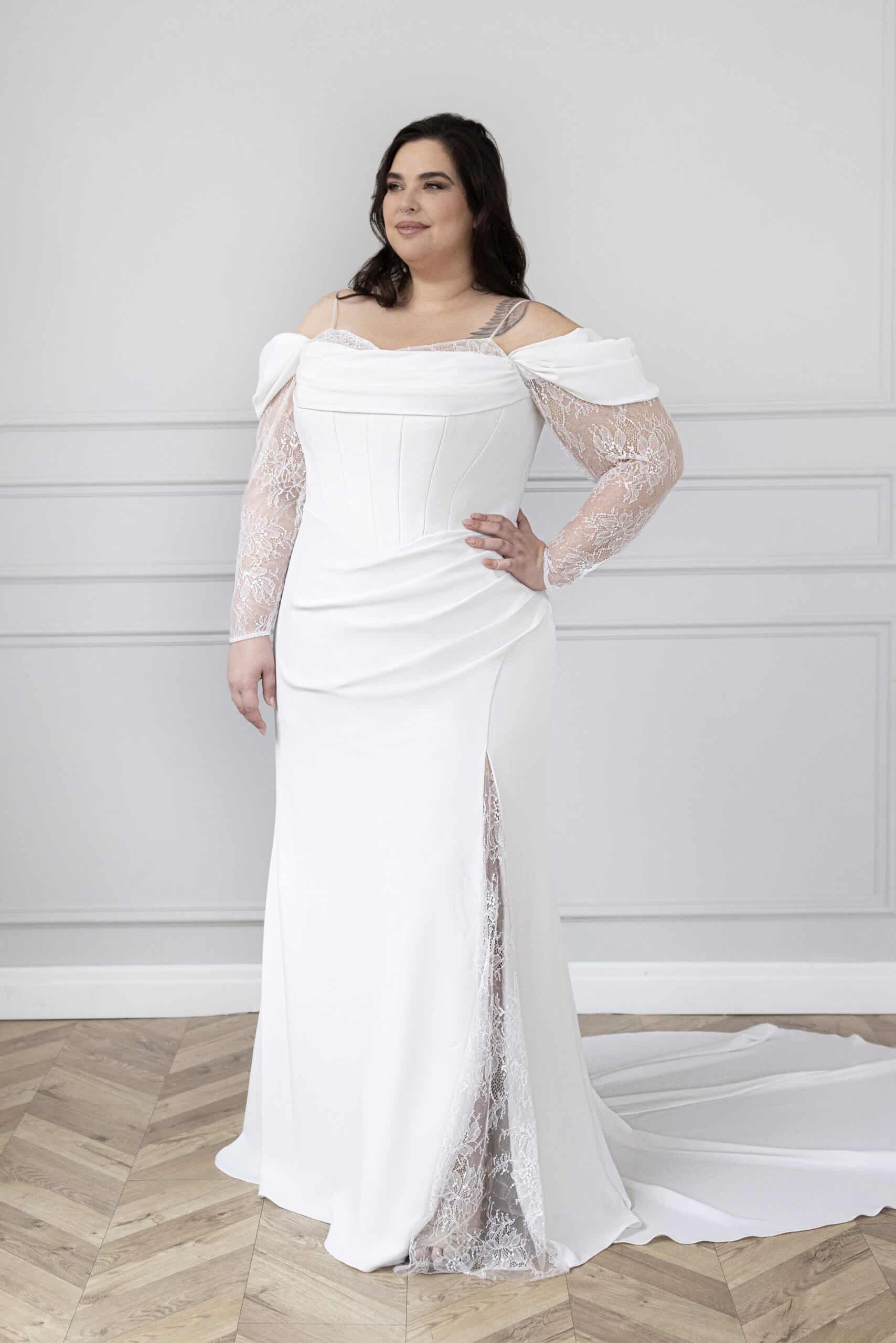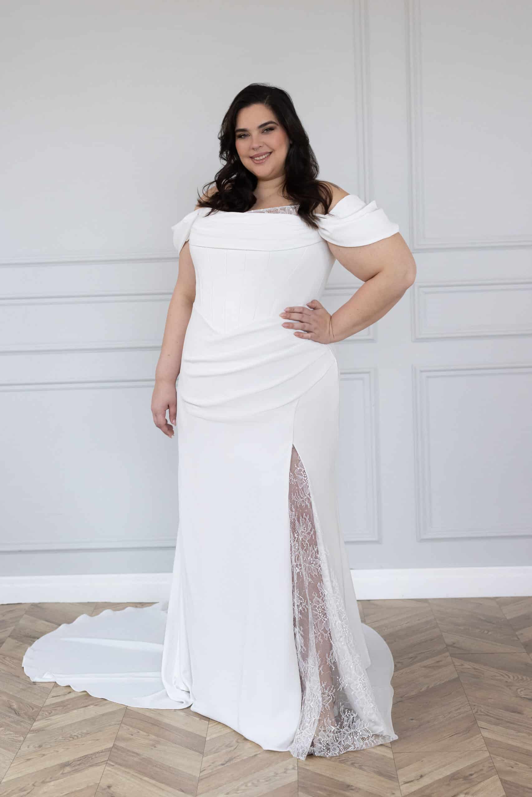 The Gra gown is an exquisite fusion of structure and softness. Crafted from sleek crepe, it features a sculpted corset bodice, draped off-the-shoulder detailing, and delicate lace sleeves. A high slit lined with lace adds a sultry edge, making this gown a statement of elegance with a hint of drama.