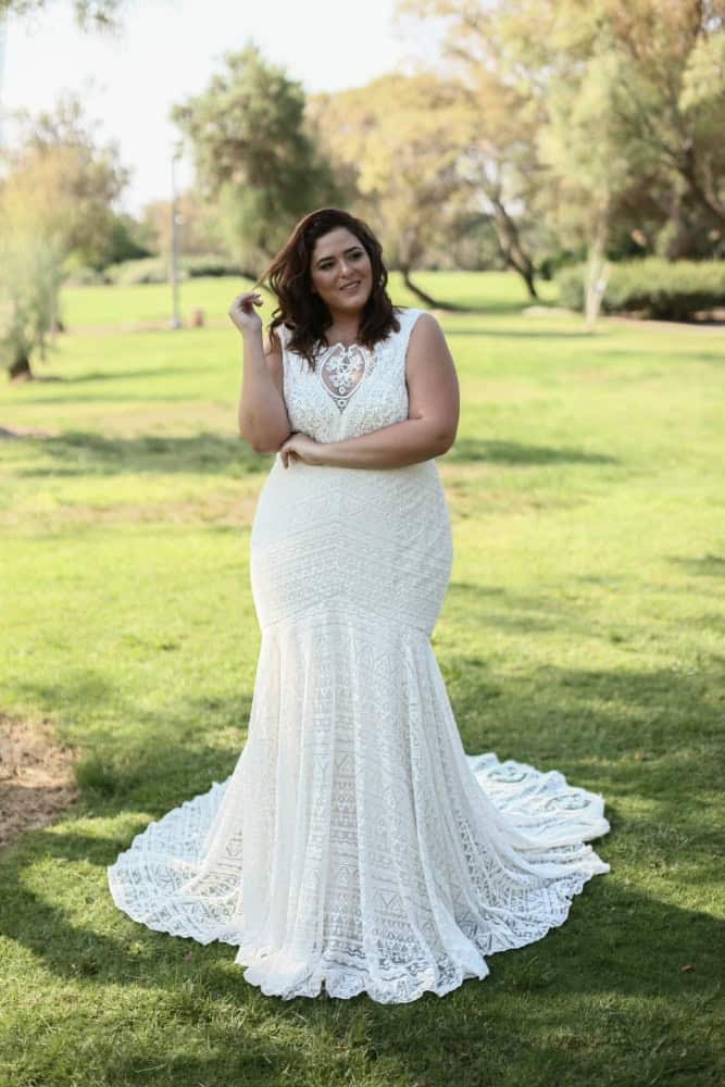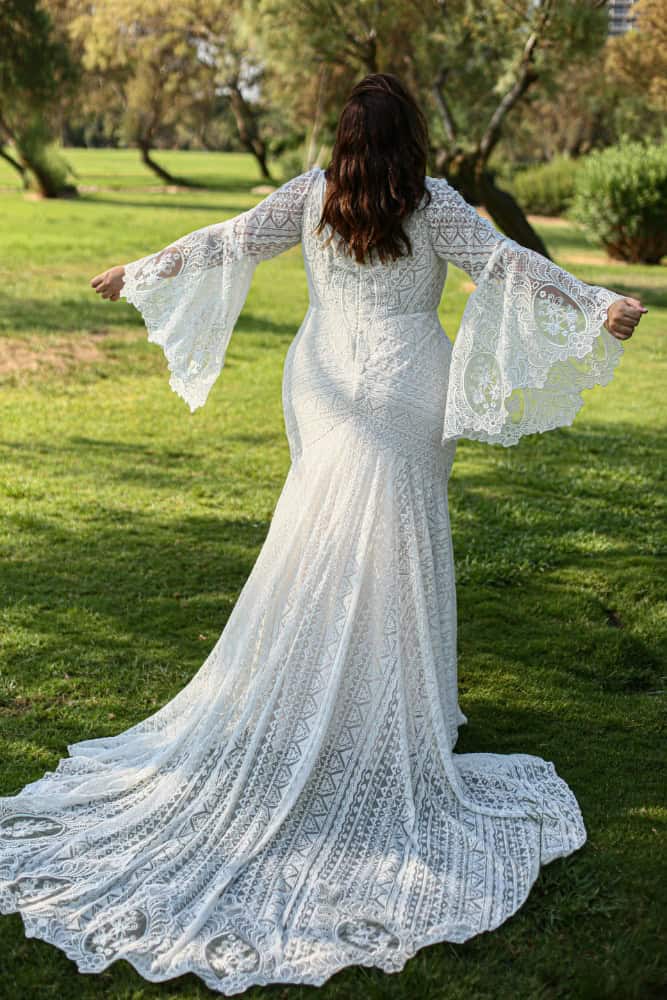 The Haven gown offers boho chic elegance with vintage geometric lace and medallion appliques. This Mermaid silhouette hugs your curves, while the flared skirt adds drama and movement. Perfect for brides who want to feel like a free-spirited goddess on their special day.