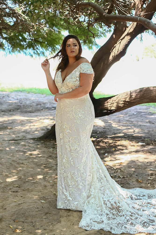 Discover Lana, our sequined lace Mermaid gown that dazzles with unique floral embroidery and a striking triangular train. The fitted silhouette accentuates your curves, creating a stunning hourglass shape. With its sparkling lace and show-stopping design, Lana ensures you’ll feel like a star on your big day.