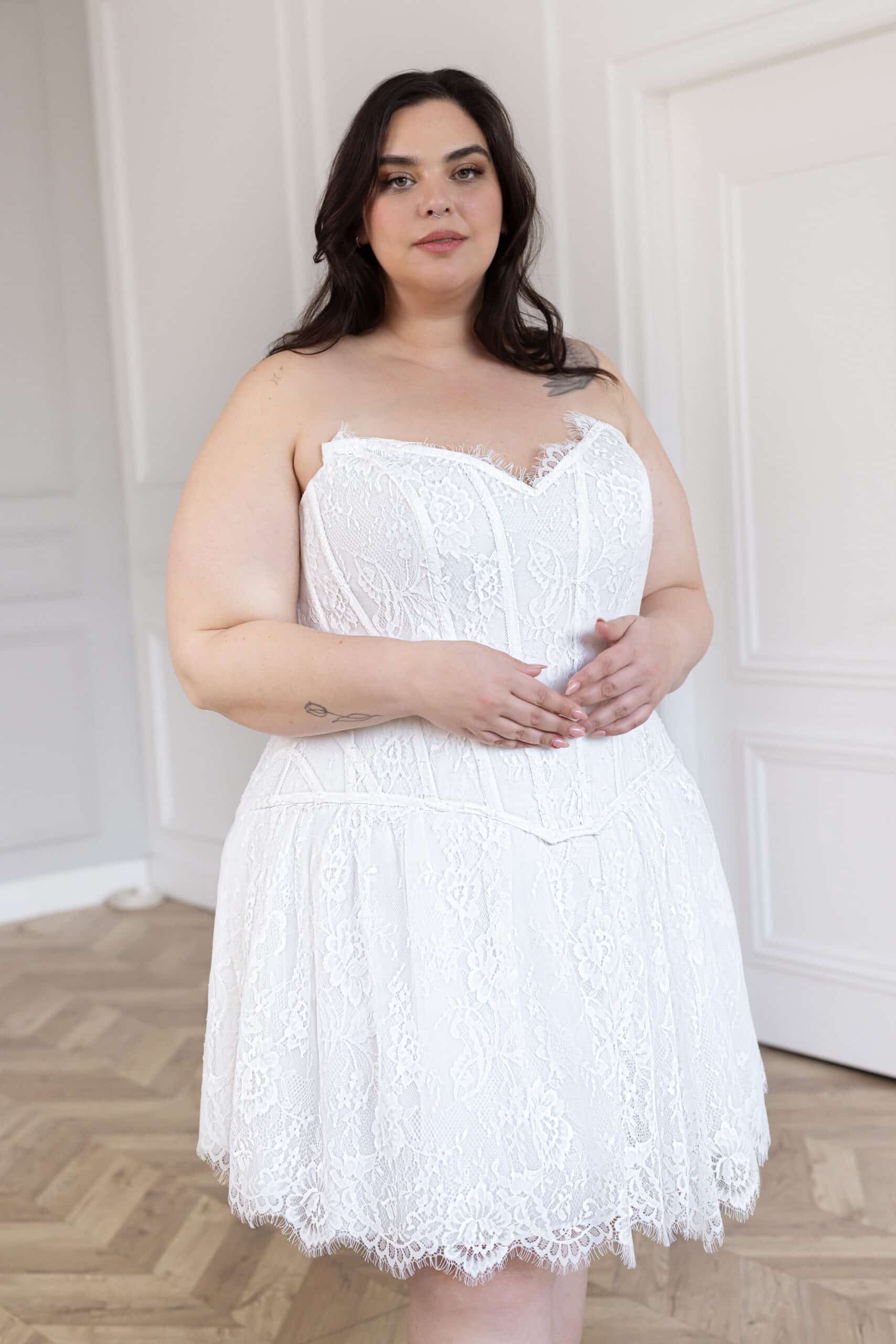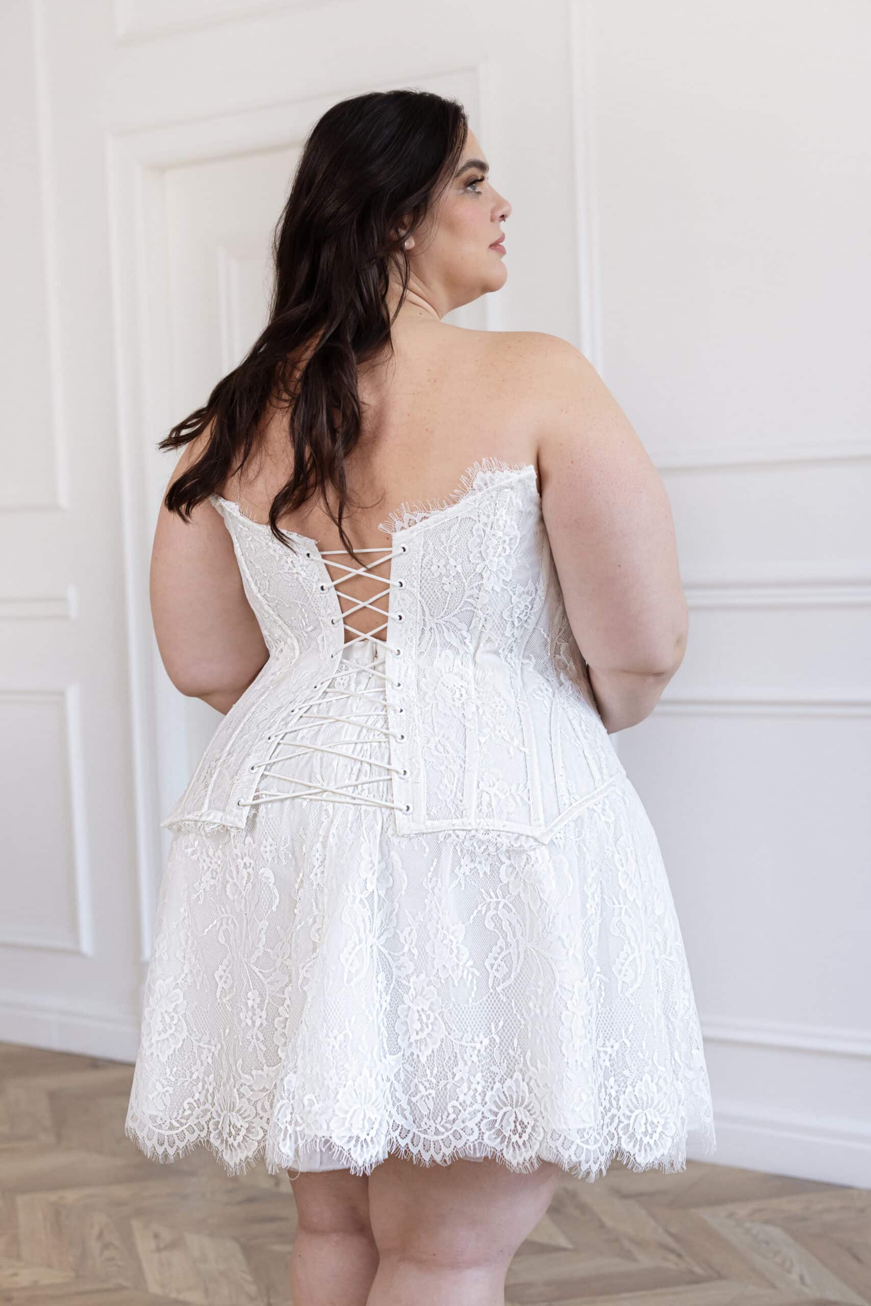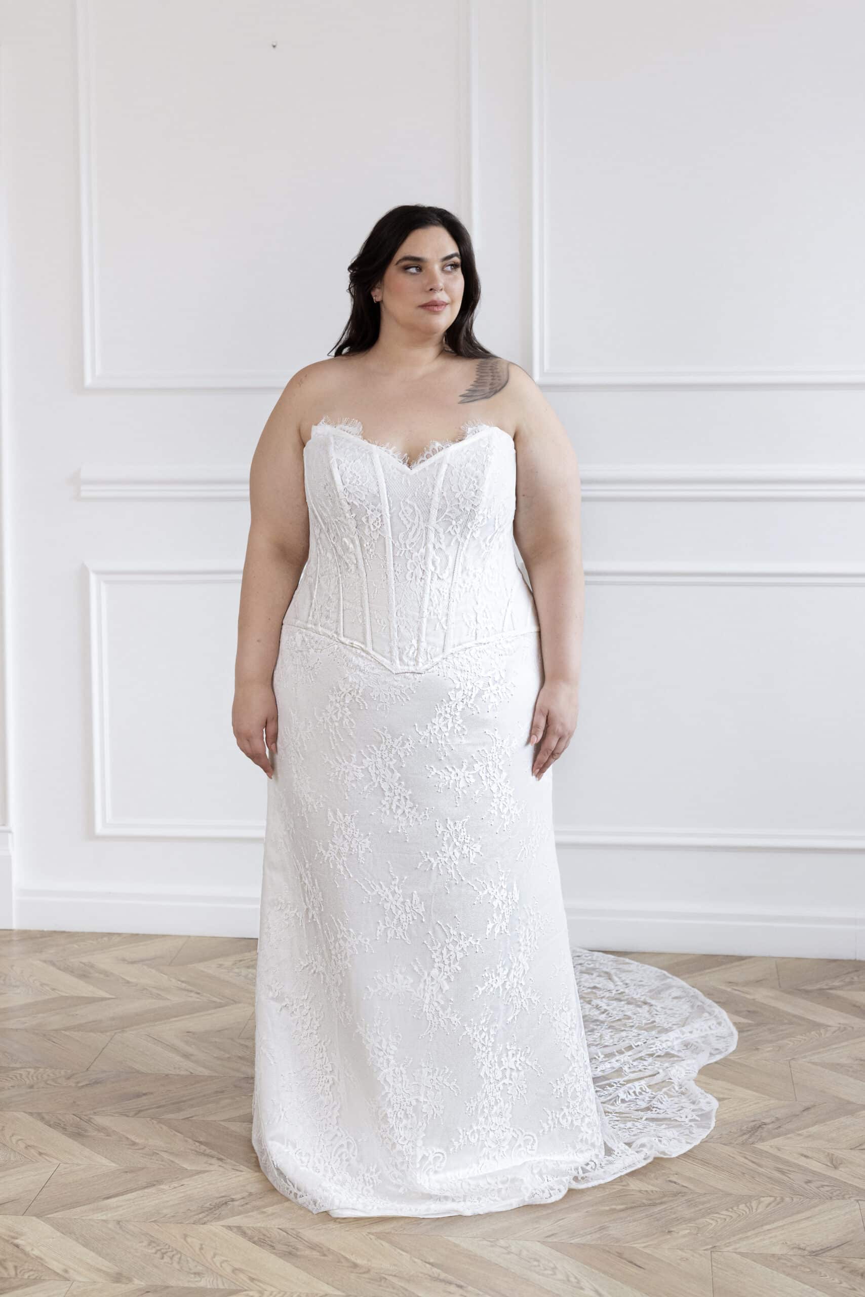 The Lumina gown is a mesmerizing fusion of ethereal lace and structured elegance. Featuring a sheer boned corset with delicate lace detailing, it sculpts the body with effortless grace. The fitted silhouette flows into a dreamy train, while the detachable lace choker adds an avant-garde touch of romance. For a bold and modern twist, an alteration with a chic short skirt is available, offering a fresh take on bridal elegance.