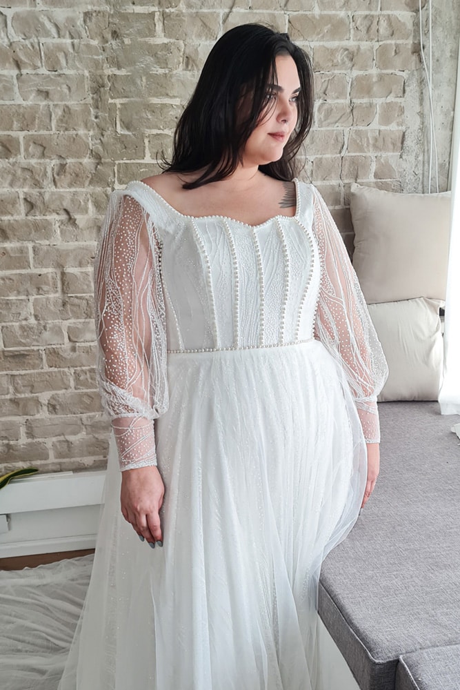 Feel like a true princess in the Patricia wedding gown. With a classic silhouette, sparkly tulle, pearl-embroidered corset, and regal Bishop sleeves, this gown exudes timeless elegance and sophistication, ensuring you captivate hearts on your special day.
