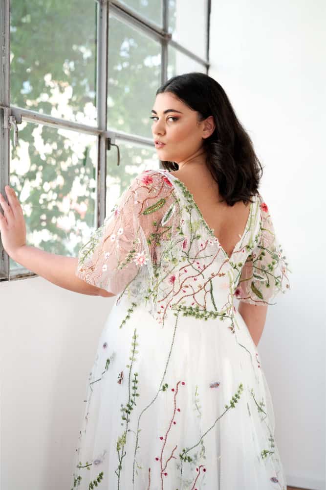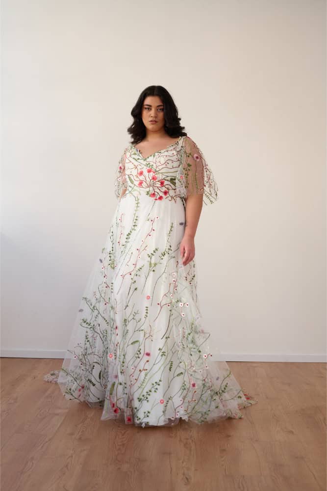 Discover our Summer gown, a whimsical masterpiece with delicate embroidery and a bold V neckline. Featuring elegant bell sleeves and a vibrant, modern color palette, this gown transcends traditional bridal norms. It’s designed for the bride seeking a harmonious blend of whimsy and sophistication, embodying individuality and a free-spirited vibe. Perfect for creating a magical and unforgettable moment on your special day.